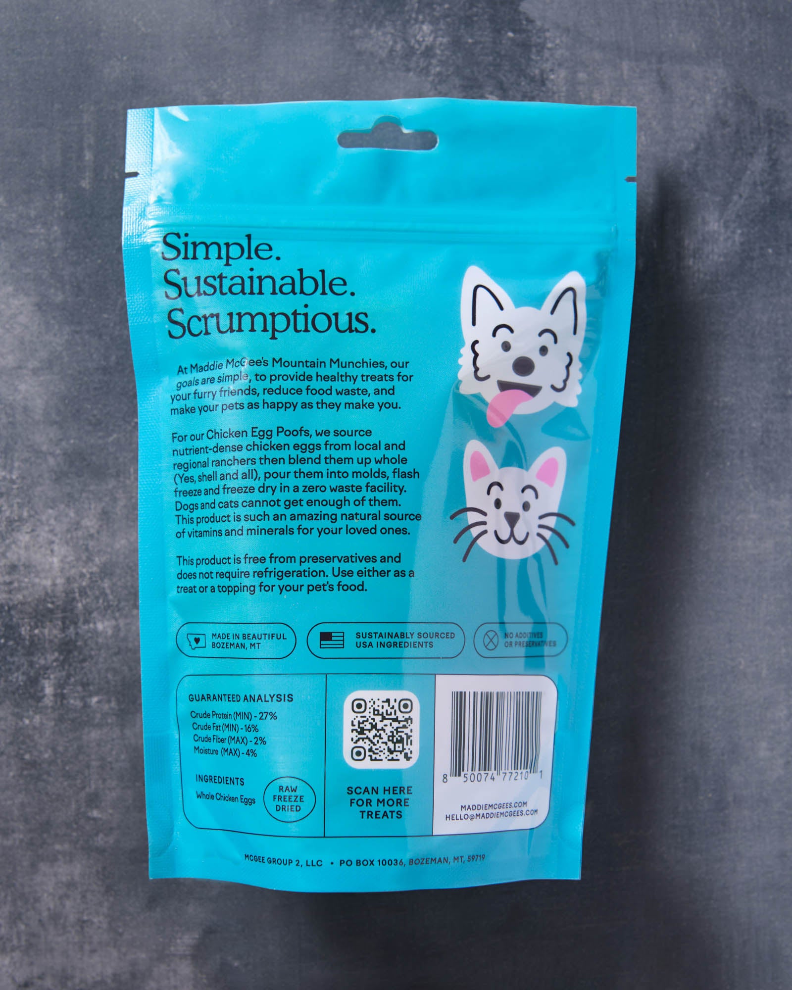 For our Chicken Egg Poofs, we source nutrient-dense chicken eggs from local and regional ranchers then blend them up whole (Yes, shell and all), pour them into molds, flash freeze and freeze dry in a zero waste facility